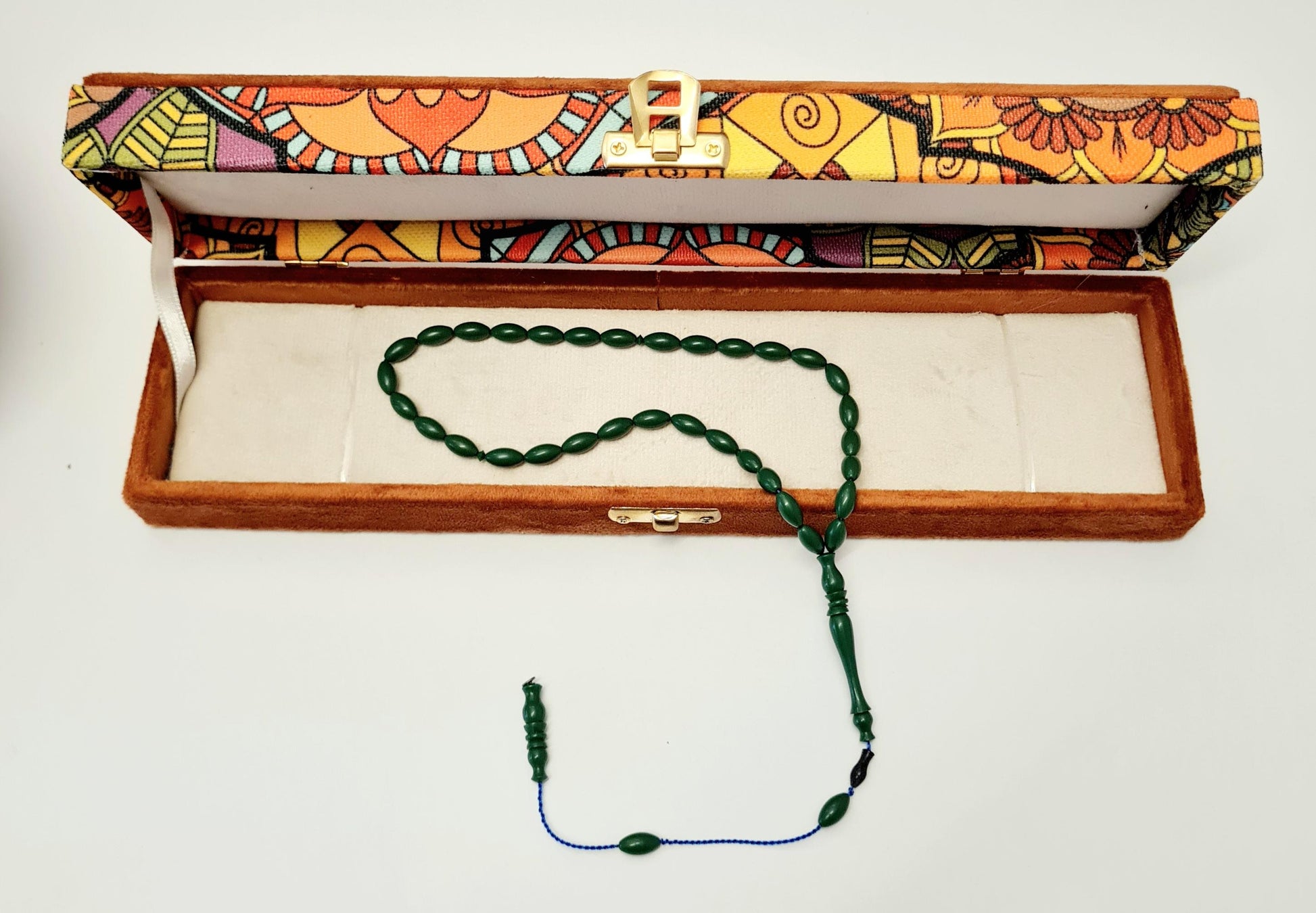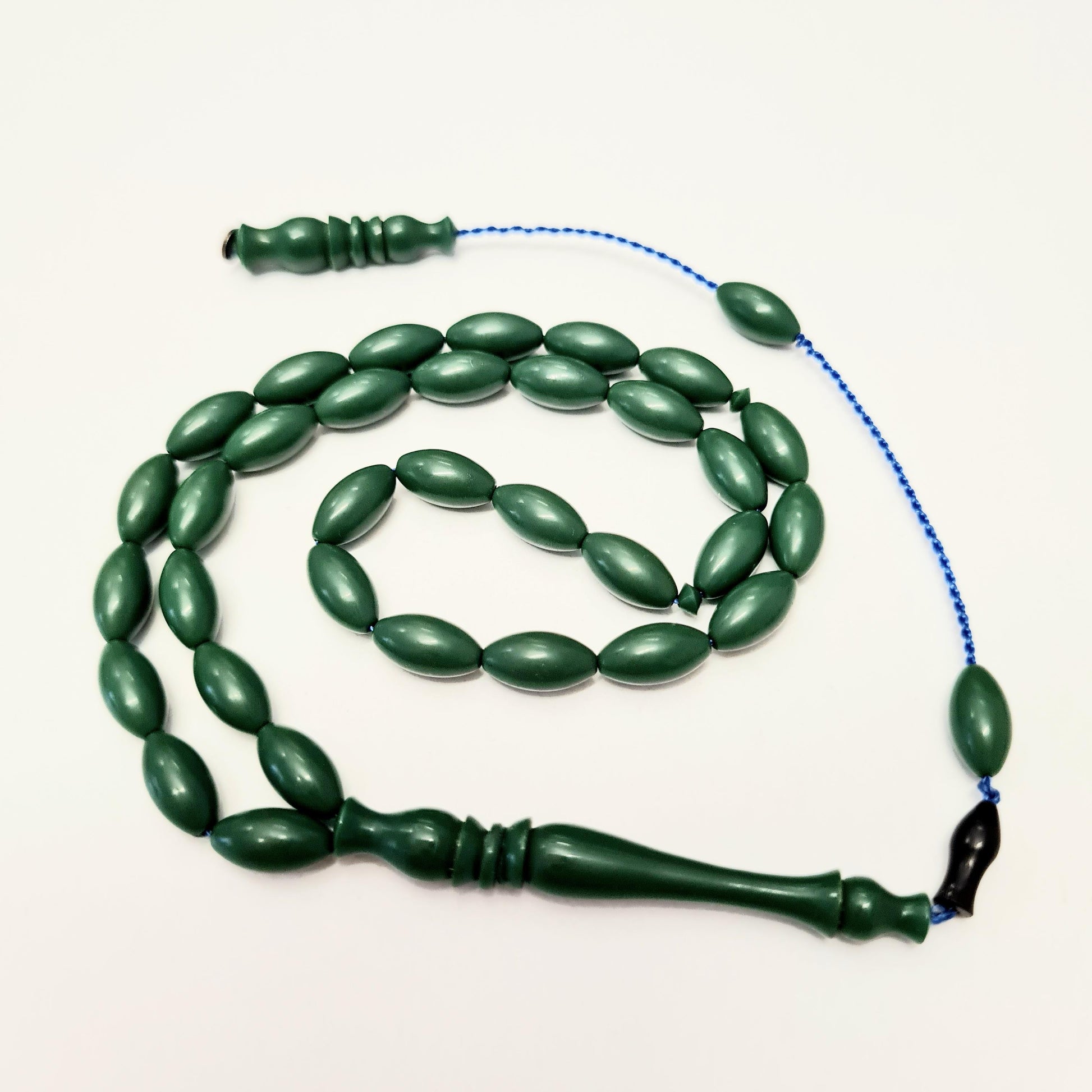 The prayer beads are shipped in a special velvet box. A modern interpretation of traditional art, this specially collected prayer bead is expertly crafted from catalin material obtained from bowling balls. Each bead measures 5x10 mm and weighs a total of 10 grams. It is shaped using a dry lathe technique and masterful hand-carving. Its elegant green color and meticulously crafted beads create a striking appearance. Its blue interwoven texture and specially designed heads bring a modern touch to the classic prayer bead form. This prayer bead, which comes in a special velvet box, is both a valuable piece for collectors and an ideal choice for everyday use. Its fine craftsmanship and high-quality material ensure long-lasting use and make it an excellent choice as a carefully chosen gift.
