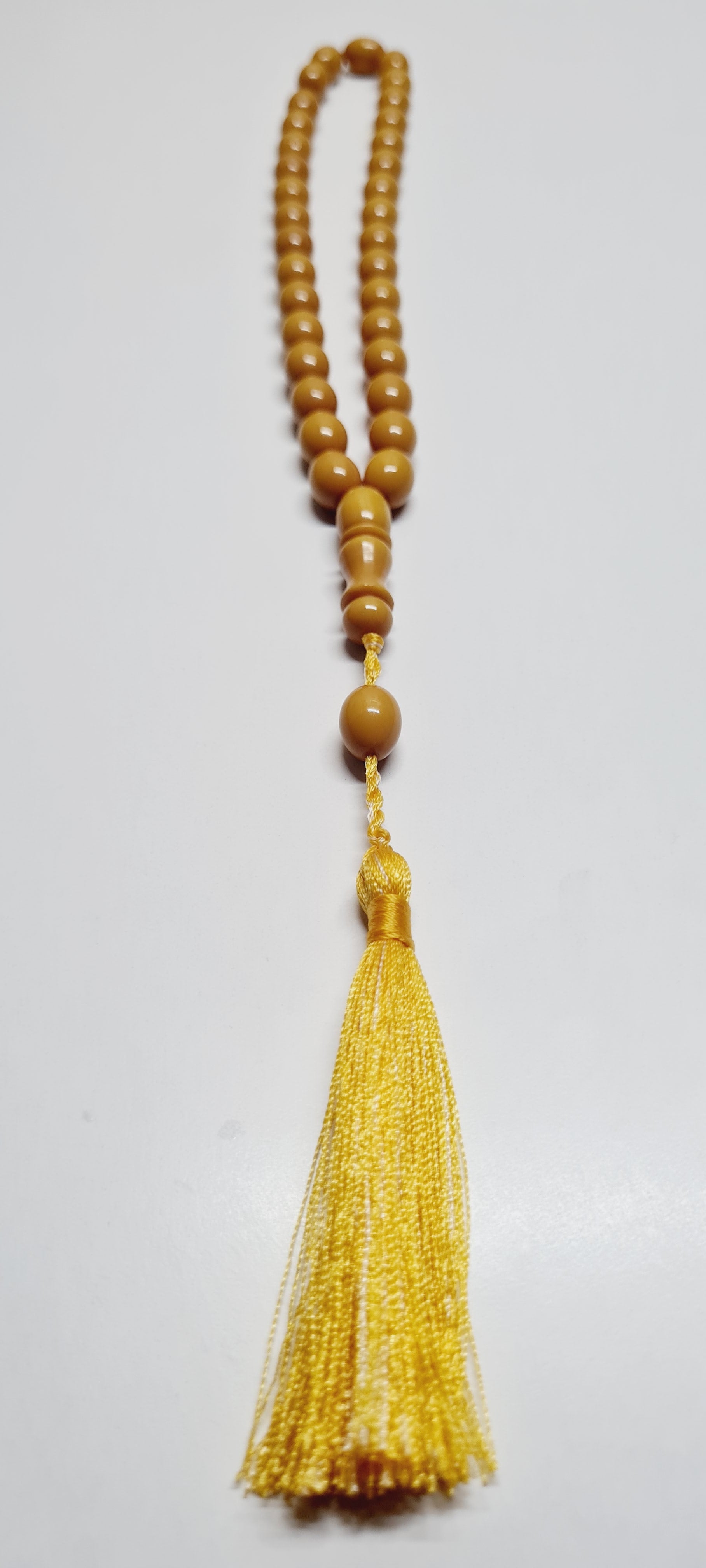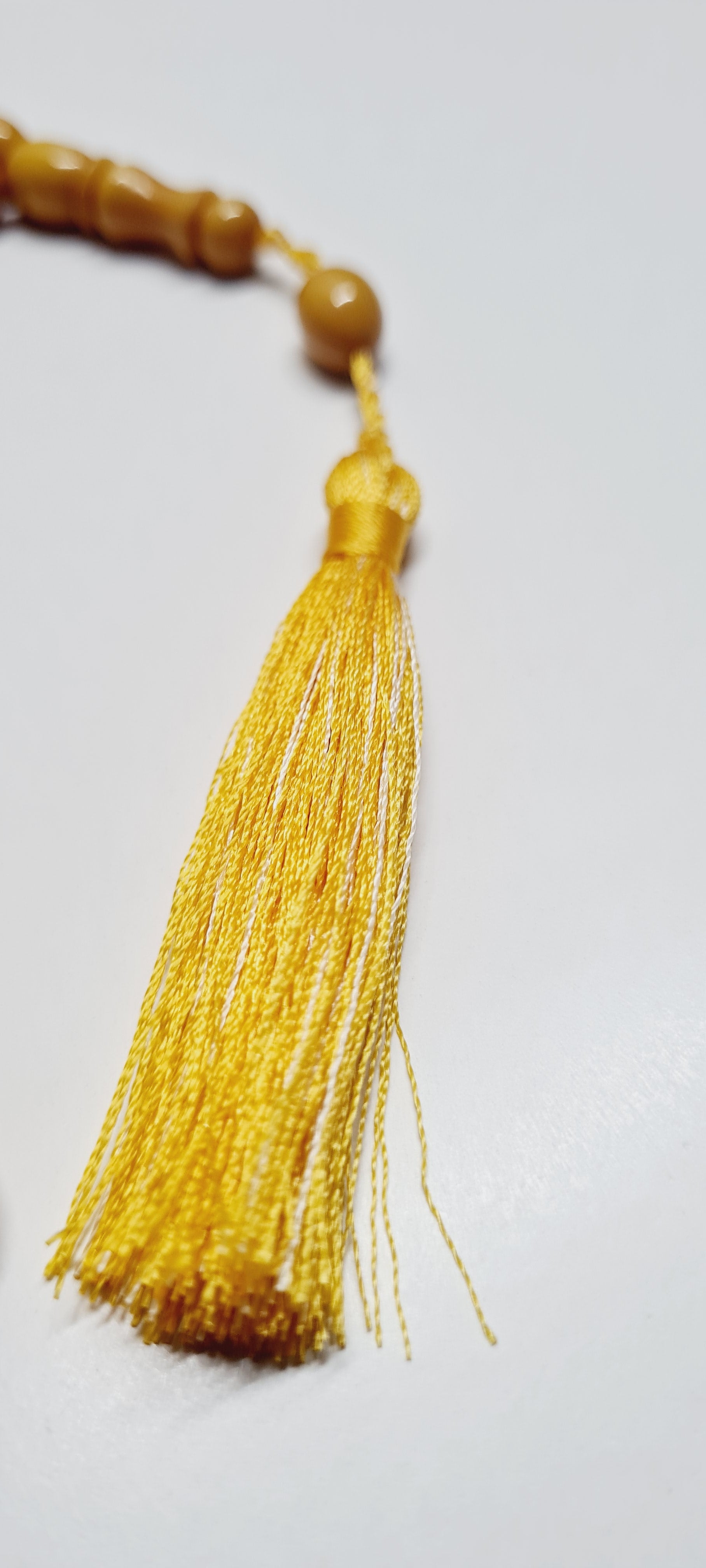 Bu özel koleksiyonluk Katalin tesbih, geleneksel zanaatkarlığın modern işçilikle buluştuğu nadide bir parça. 35 cm uzunluğunda olan tesbih, 9 x 12 mm boyutlarında özenle işlenmiş tanelerden oluşuyor ve toplam 30 gram ağırlığında. Eski döküm tekniğiyle üretilmiş ve yeni traşlama işlemiyle mükemmelleştirilmiş bu tesbih, karamel tonlarında hoş bir renge sahip. Göz alıcı altın renkli püskülü ve özel işçiliği ile dikkat çeken tesbih, koleksiyonerler için ideal bir seçim. Her bir tane özenle dizilmiş ve pürüzsüz bir yüzeye sahip. Orta kısmındaki özel tasarım detayı ve dengeli ağırlığı ile kullanım konforu sunar. Geleneksel tesbih sanatının modern bir yorumu olan bu parça, hem koleksiyon değeri taşıyor hem de günlük kullanıma uygun. Özel kutusunda muhafaza edilmesi önerilir.