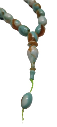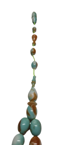 Fransız Galilit Eski Döküm Malzemeden yapılmış bu etkileyici Tespih, turkuaz ve kahverengi tonlarının zarif bir harmonisini sunuyor. Her biri özenle işlenmiş oval formlu boncuklar, yeşil iplikle birbirine bağlanarak benzersiz bir tasarım oluşturuyor. Yaklaşık 38 cm uzunluğundaki Tespih, Düzensiz dokusu ve organik görünümüyle her kıyafete doğal bir şıklık katacak bu aksesuar, özel günlerinizde veya günlük kullanımda tercih edebileceğiniz özgün bir parça. Her bir boncuğun kendine has renk geçişleri ve desenleri, Tespihi benzersiz kılıyor. Hafif yapısı sayesinde uzun süre rahatlıkla kullanılabilir.