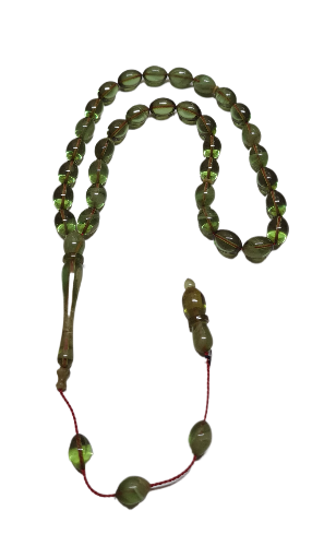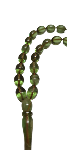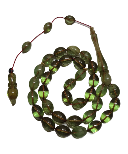 Zarif ve etkileyici görünümlü bu tesbih, özel tasarlanmış yeşil renkli taneleriyle dikkat çekiyor. Her bir tane özenle işlenmiş olup, kırmızı renkli bağlantı ipleriyle birbirine bağlanmıştır. Klasik tesbih formunda tasarlanmış bu parça, 33 adet tane içermektedir. Taneler oval formda olup, ışığı yansıtan parlak bir yüzeye sahiptir. İmame ve püskül kısmı da ana gövdeyle uyumlu şekilde tasarlanmıştır. Geleneksel zikir çekme ritüelleri için ideal olan bu tesbih, aynı zamanda dekoratif bir aksesuar olarak da kullanılabilir. Her bir tanenin boyutu ve ağırlığı, rahat kullanım için optimize edilmiştir. Özel koleksiyonunuza ekleyebileceğiniz bu tesbih, hem günlük kullanım hem de özel anlar için mükemmel bir seçimdir.