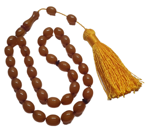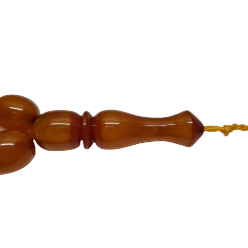 Bu özel koleksiyonluk tespih, geleneksel Türk el sanatının muhteşem bir örneğidir. 15 x 12 mm boyutlarındaki oval kehribar renkli taneleri, usta ellerde özenle işlenmiş eski döküm malzemeden yapılmıştır. 62 Gr toplam ağırlığa ve 46 cm'lik uzunluğa sapa sahip olan bu tespih, kuru torna tekniği kullanılarak üretilmiştir. Katalin malzemeden yapılan taneler, pürüzsüz ve parlak bir yüzeye sahiptir. Altın sarısı püskülü ve özel işçiliği ile göz alıcı bir görünüm sunar. Her bir tane arasındaki ince işçilik ve düzenli aralıklar, ustalığın en güzel kanıtıdır. Koleksiyonerler için özel değere sahip olan bu tespih, geleneksel zanaatkarlığın modern bir yorumunu sunmaktadır. İnce detayları ve kaliteli malzemesiyle, hem kullanım hem de koleksiyon için ideal bir seçimdir.