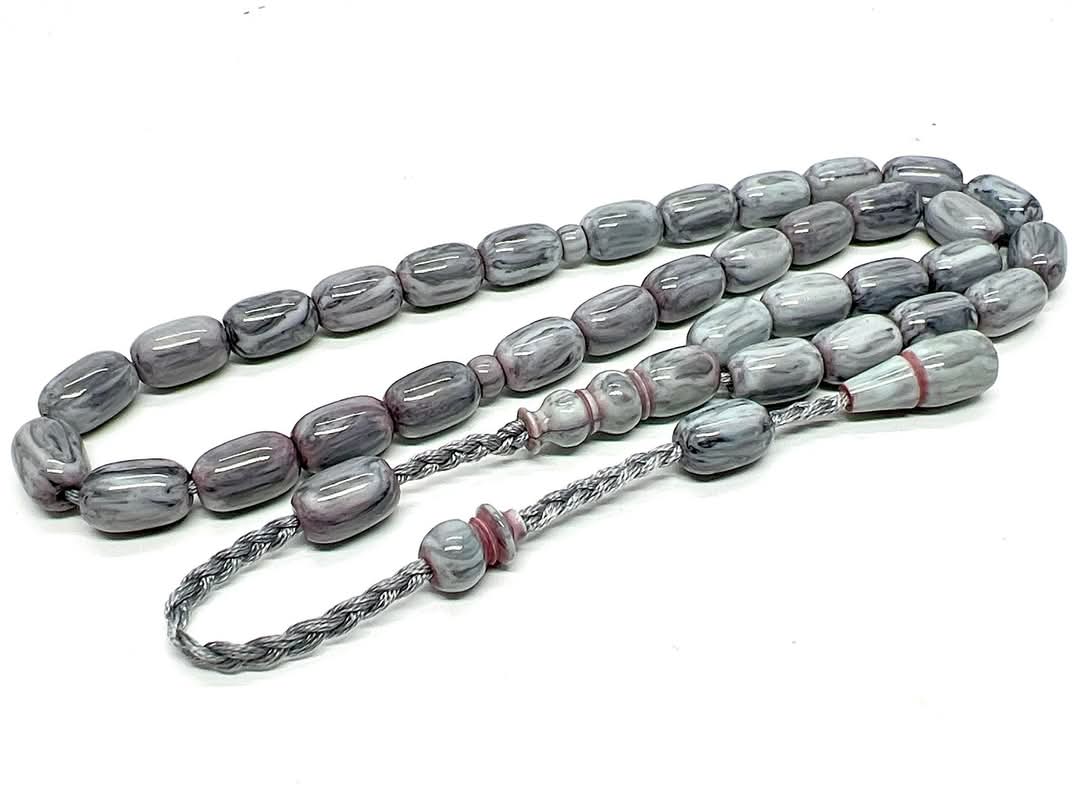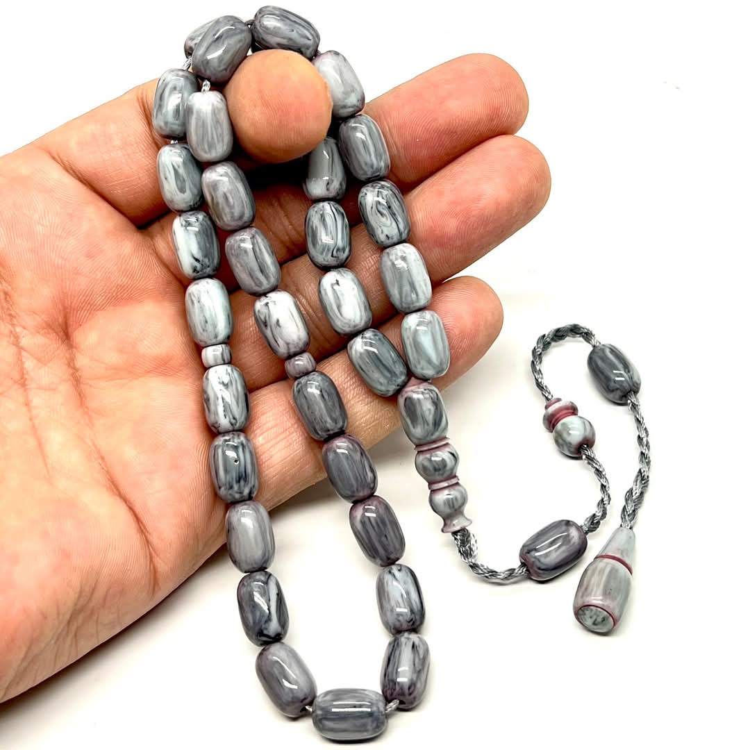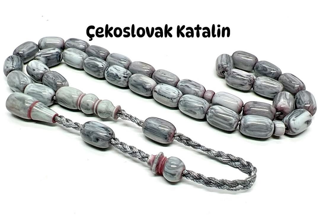 Geleneksel sanatın modern zamanlarla buluştuğu bu nadide tespih, Çekoslovak Katalin malzemesinden özenle işlenmiştir. 8 x 12 mm boyutlarındaki taneleri ve 25 gram toplam ağırlığıyla mükemmel bir denge sunar. Kuru torna tekniğiyle, eski usül el işçiliğinin en güzel örneklerinden biri olarak karşımıza çıkar. Her bir tane özenle şekillendirilmiş olup, gri tonlarındaki doğal görünümüyle göz alıcı bir koleksiyon parçasıdır. Gümüş renkli örgülü püskülü ve ara taneleriyle klasik tespih geleneğini yaşatır. Usta ellerde şekillenen bu tespih, koleksiyonerler için özel bir değer taşır. Her bir detayında geleneksel ustalığın izlerini taşıyan bu eşsiz parça, tespih tutkunları için vazgeçilmez bir seçenek olacaktır.
